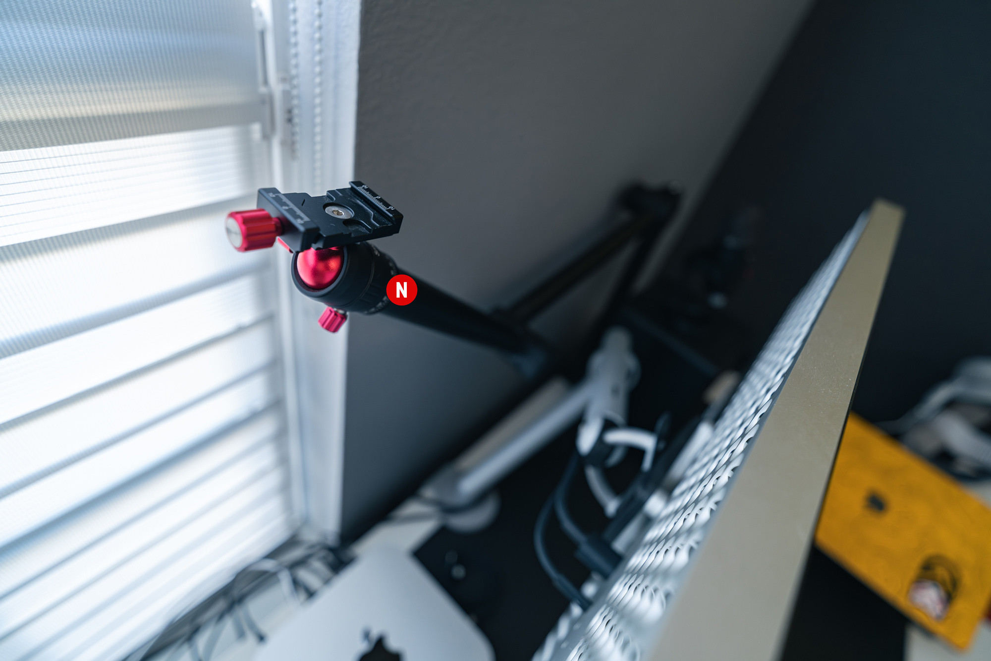 This desk mounted camera mount is hidden behind my display until I need to do an occasional video conference call. I mount my Sony ZV-E1 to it and lower my monitor slightly to bring my camera into view.