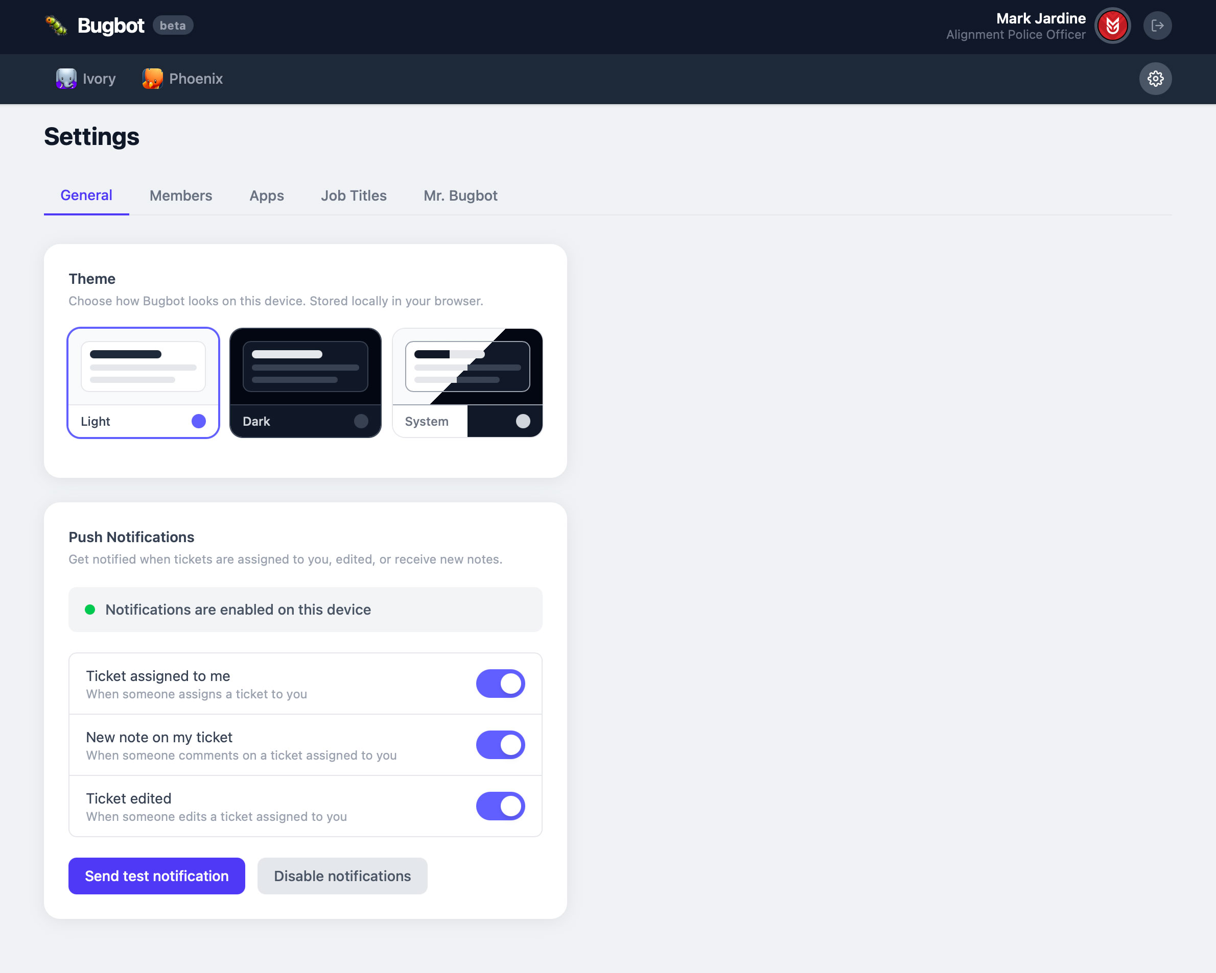 The settings area is like peeking behind the curtain and seeing the Wizard of Oz. I recently added push notifications because I had no idea tasks were getting assigned to me throughout the day if I wasn’t actively looking at and refreshing pages in Bugbot.