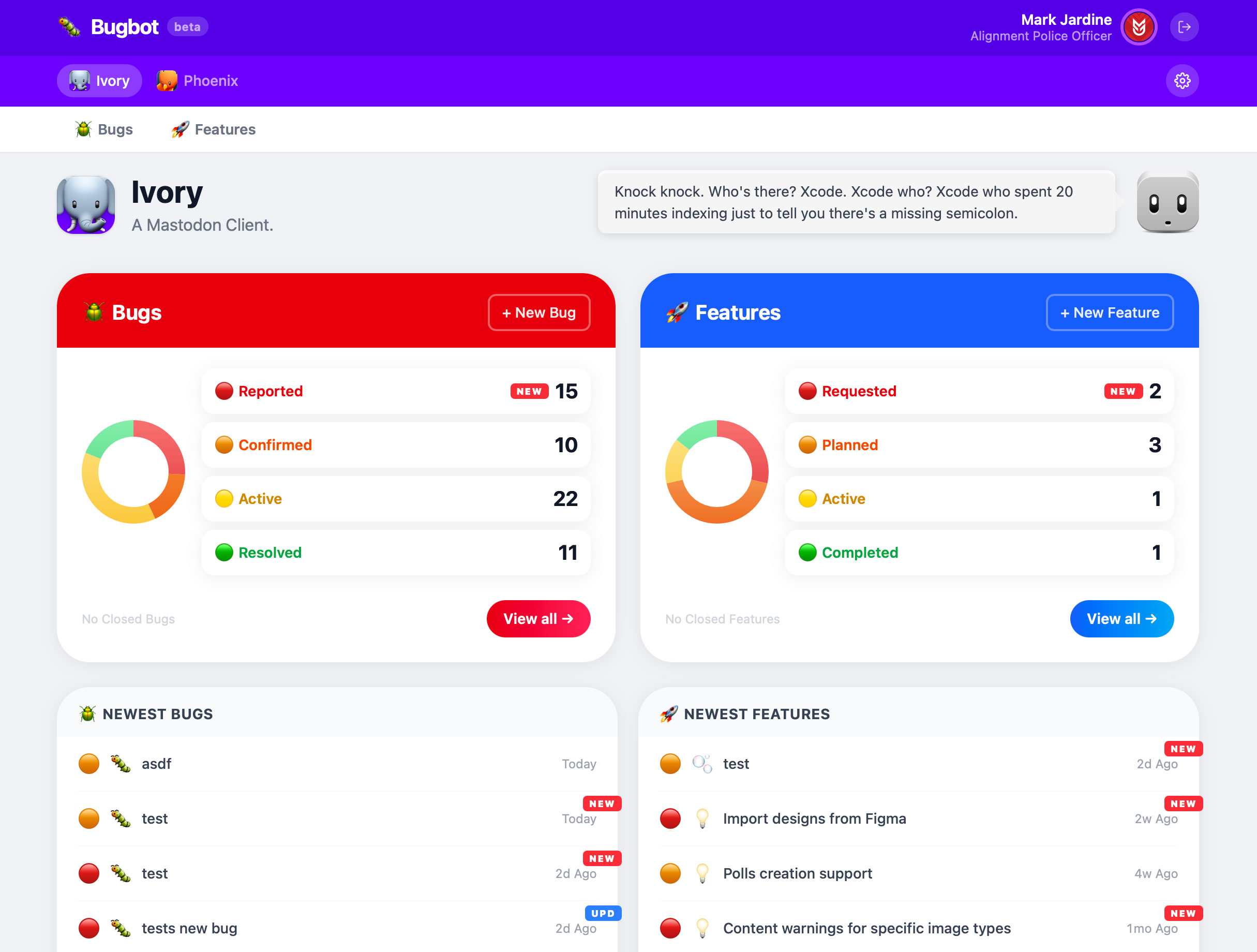 When you drill into a specific app, you get this overview page. I thought it was a nice touch to tint the header with the dominant app color. You’ll notice I have Bugs as Red and Features as Blue (it was also on some of the buttons on the main dashboard that was shown previously). Also worth noting is I wanted to color-code the status of each ticket. Bugs and Features are slightly different, but I still wanted them to follow the same color coding (from red to green).