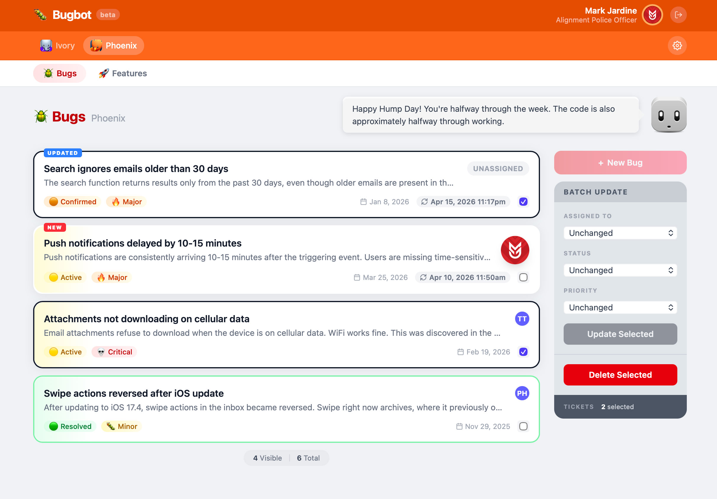 Note: Screenshots are captured from the actual functioning app on my test server. All the ticket data in these screenshots is fake. While I typed in gibberish when testing things, most ticket data was generated by Claude for testing purposes. I also used Sonnet for 99% of the work. I ran into a few issues trying to get Mr. Bugbot laid out visually which kept failing me so I tried switching to Opus, but turned out it was most likely a complex CSS/browser rendering limitation.