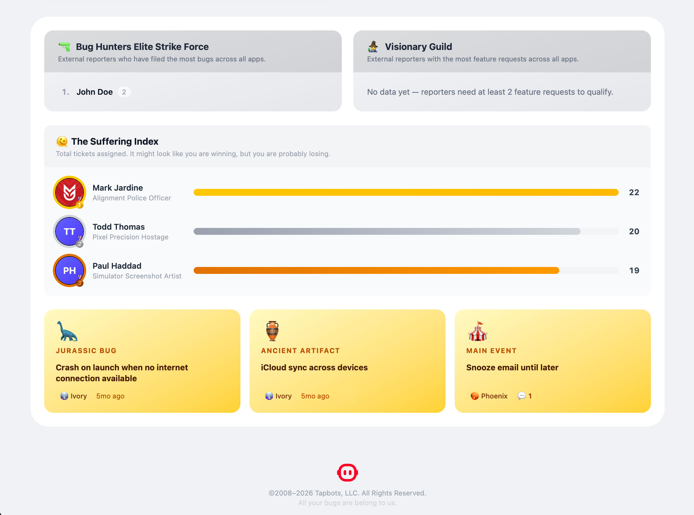 At the bottom of the dashboard, I wanted to add some pointless, but entertaining data points. Most are self-explanatory. Jurassic Bug is the oldest bug report that is still open on the site, Ancient Artifact is the oldest feature request, and Main Event is the ticket that has the most notes on it.