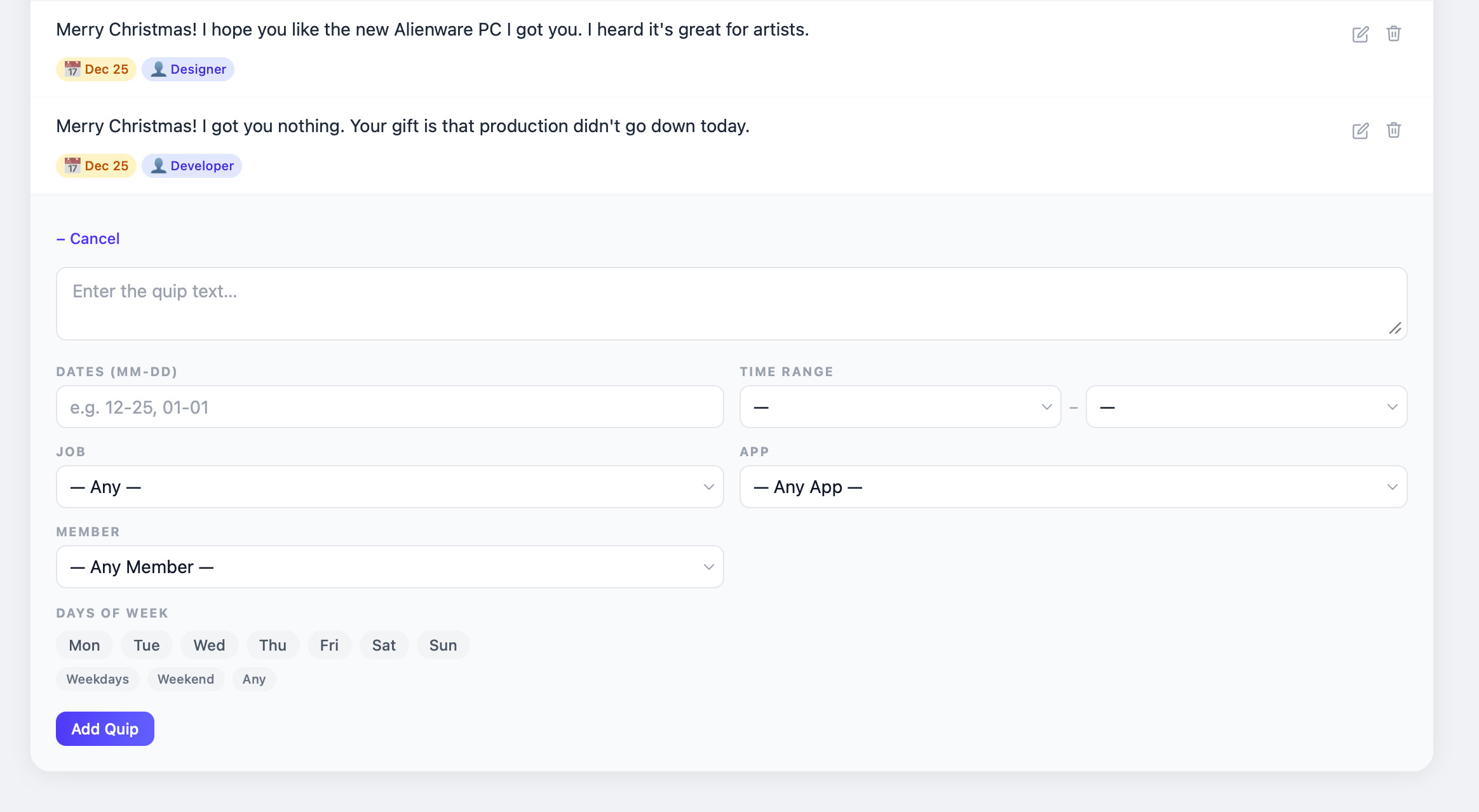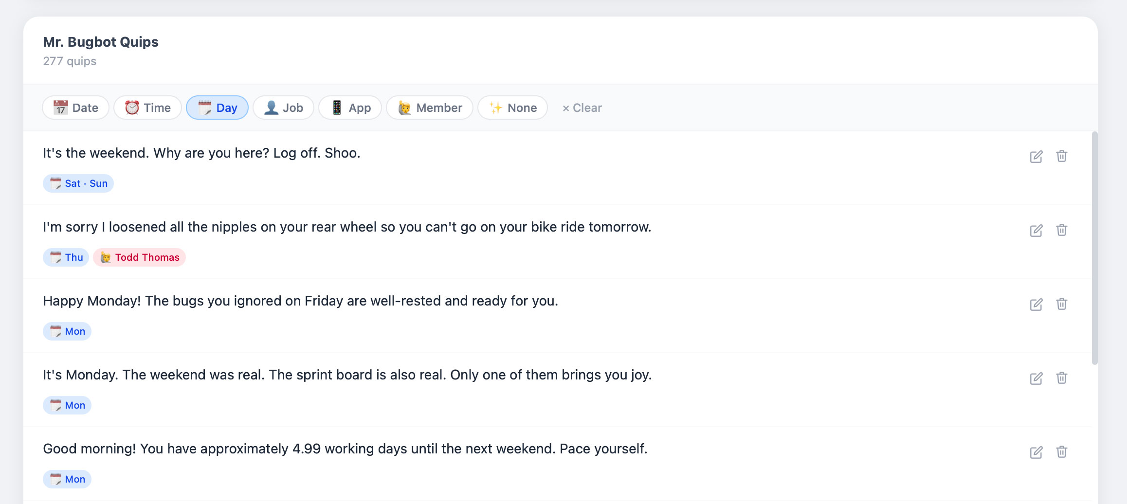 This is a list of all the quips that have been generated (I created some as well, but mostly generated). You can filter by different criteria (I like the one I added for Todd on a Thursday because Fridays are usually his riding days).