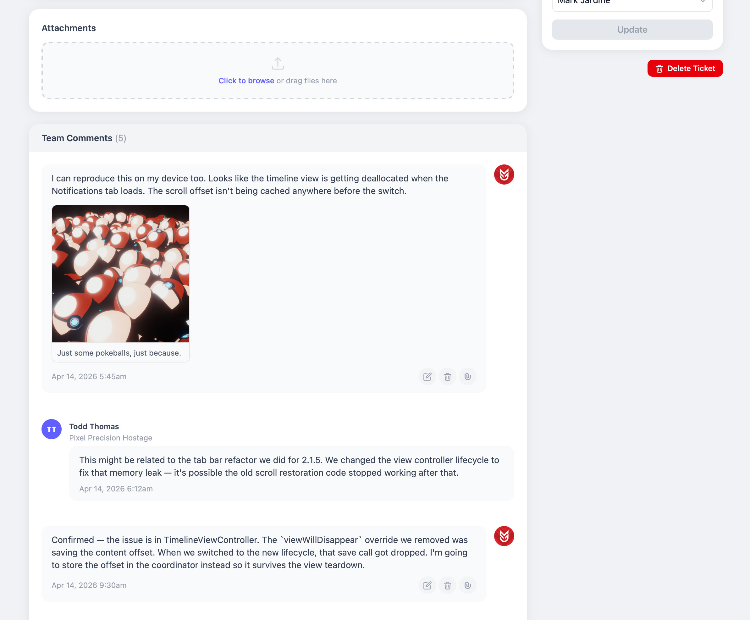 Under attachments, members of the team can write comments relevant to each ticket. They can also upload files here and add notes to the files.