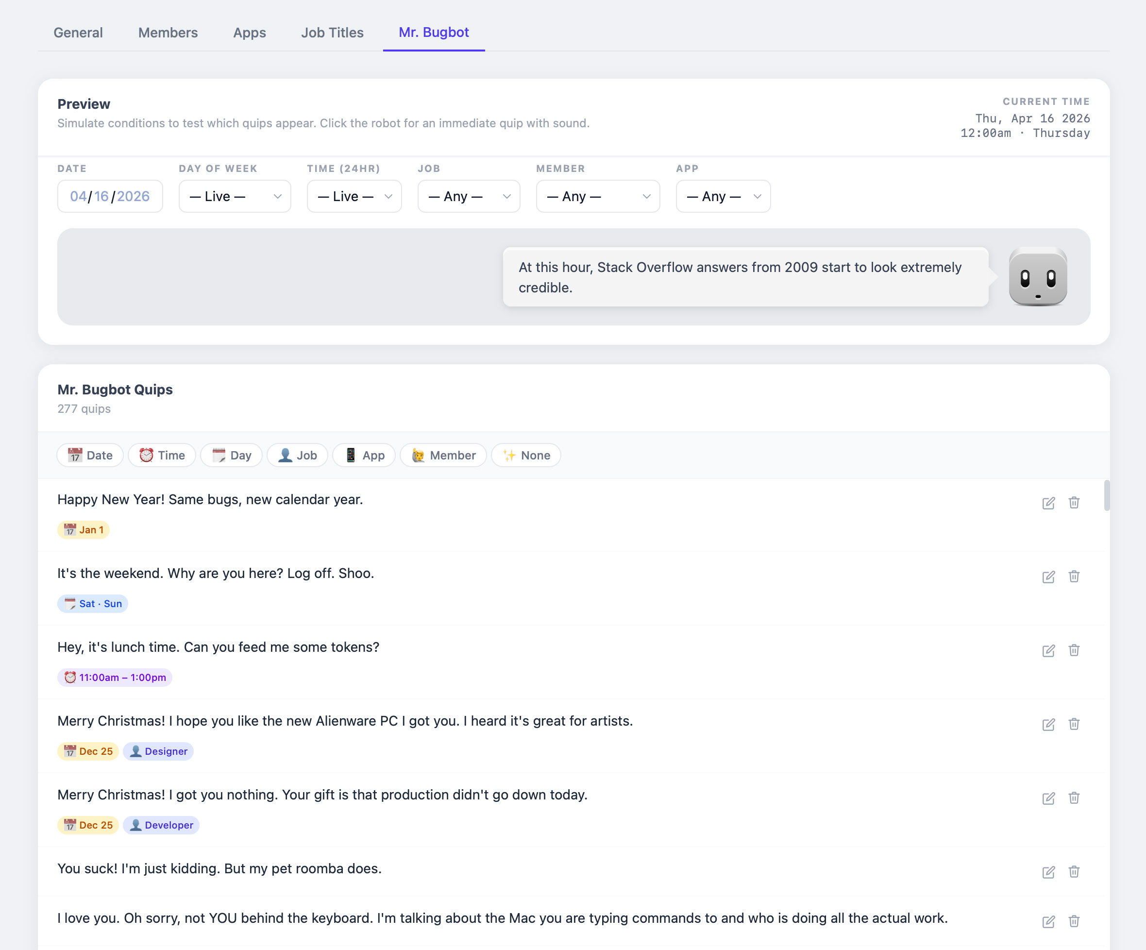 And probably the most insane part of this website…a feature in which no developer would ever waste so much time building for a bug tracking app…Mr. Bugbot. This settings page is for creating and testing Mr. Bugbot quips, and the criteria for when one shows up is practically endless! I’ll be honest, I racked my brain trying to come up with this and if it wasn’t for the help from Claude, I wouldn’t be smart enough to come up with the game plan around how how to make this, let alone developing it. The top preview area allows me to simulate all the scenarios to see what quips show up that match the criteria.