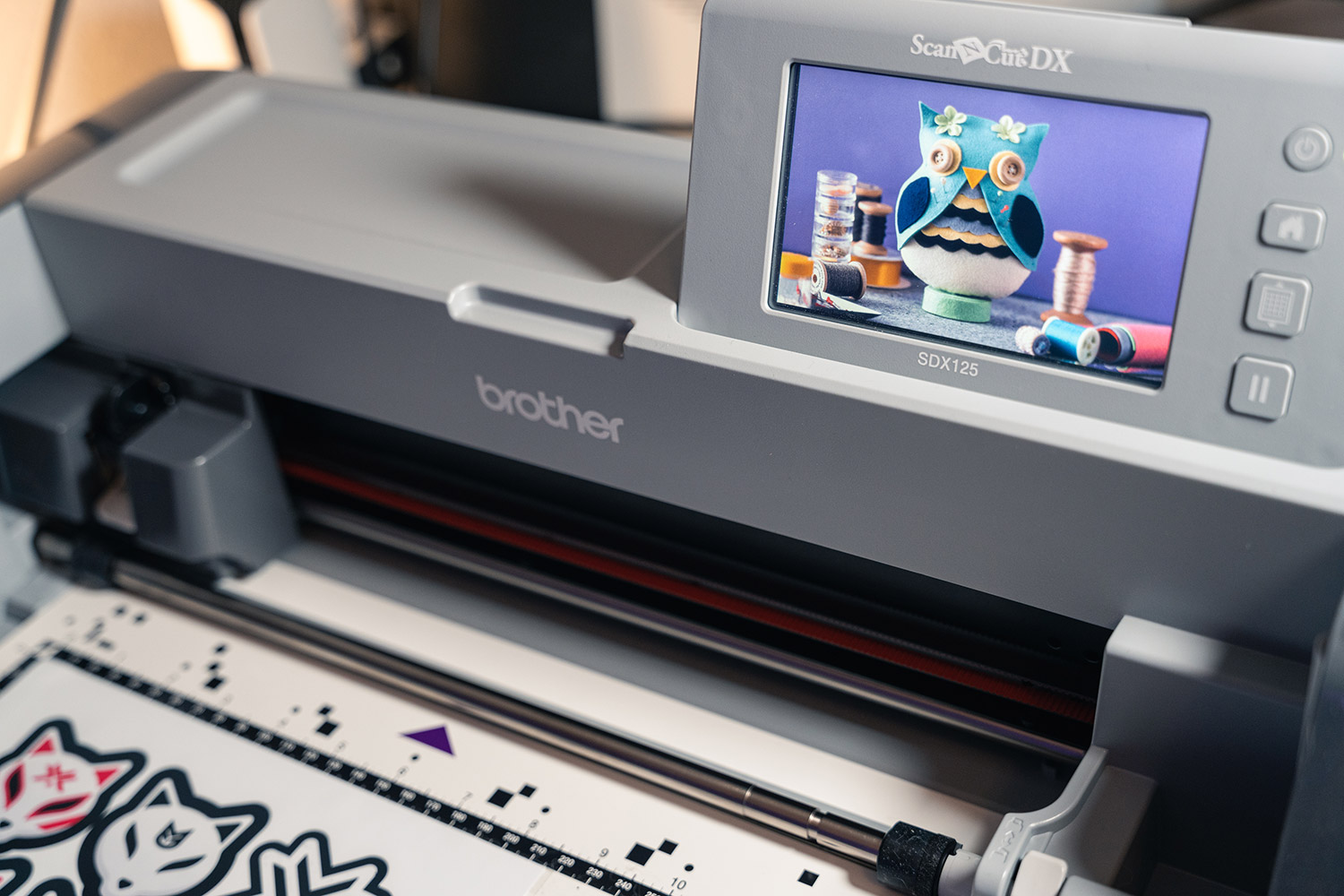 Similar to Cricut, the Brother ScanNCut has a tacky cutting mat for you to place your sticker sheet onto. Do your best to line up the top and left edge of your sticker paper with the black border of the cutting mat. The straighter you can place your paper, the less work you’ll need to do in the software to align your cut file to the artwork. Press your artwork down to make sure it’s properly stuck onto the mat.