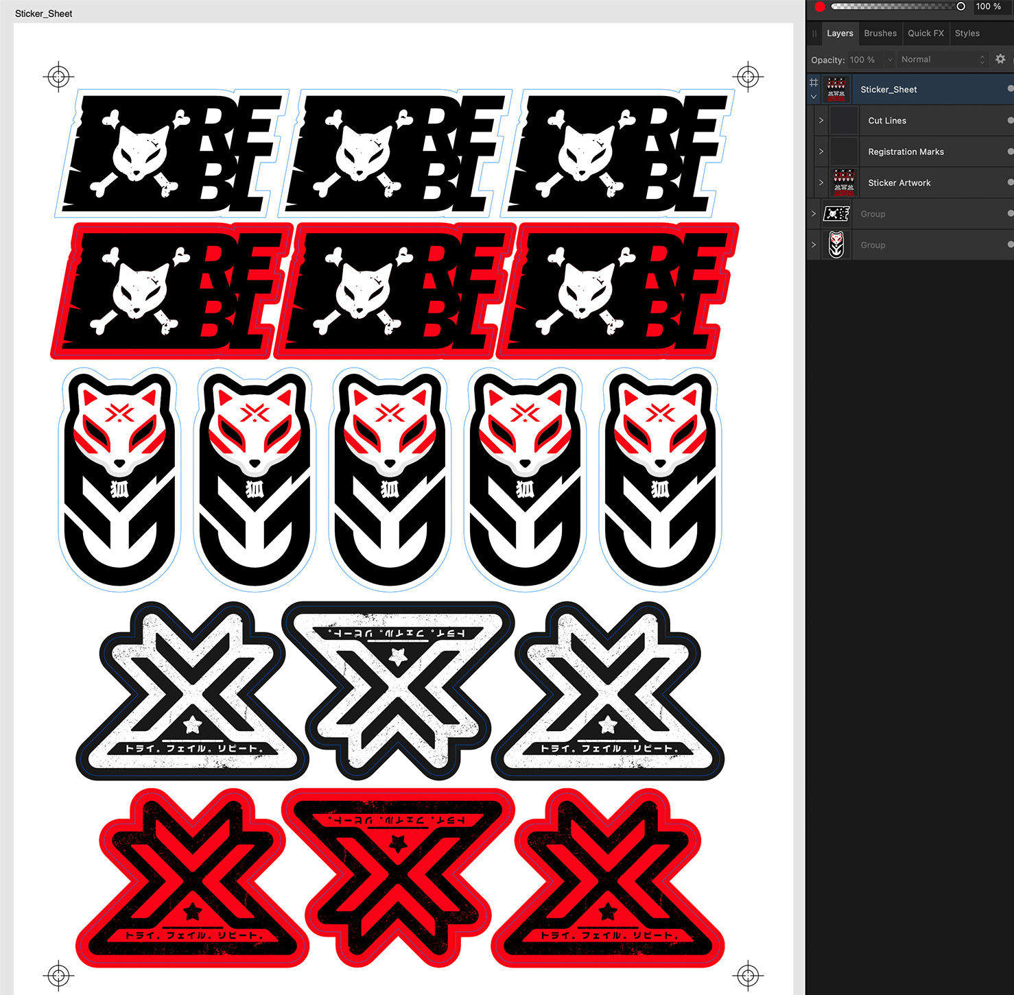 The first step is to prep your artwork for print. I use Affinity Designer, but you can use any vector-based application. A raster application works fine too in most cases, but you’ll need to export a vector file for the cut lines. Place all of your artwork on an 8.5x11” (letter) artboard. Make sure to keep stickers away from the edges where the printer won’t print. You could potentially set the printer to print full bleed to make use of more of the paper, but I don’t do that.