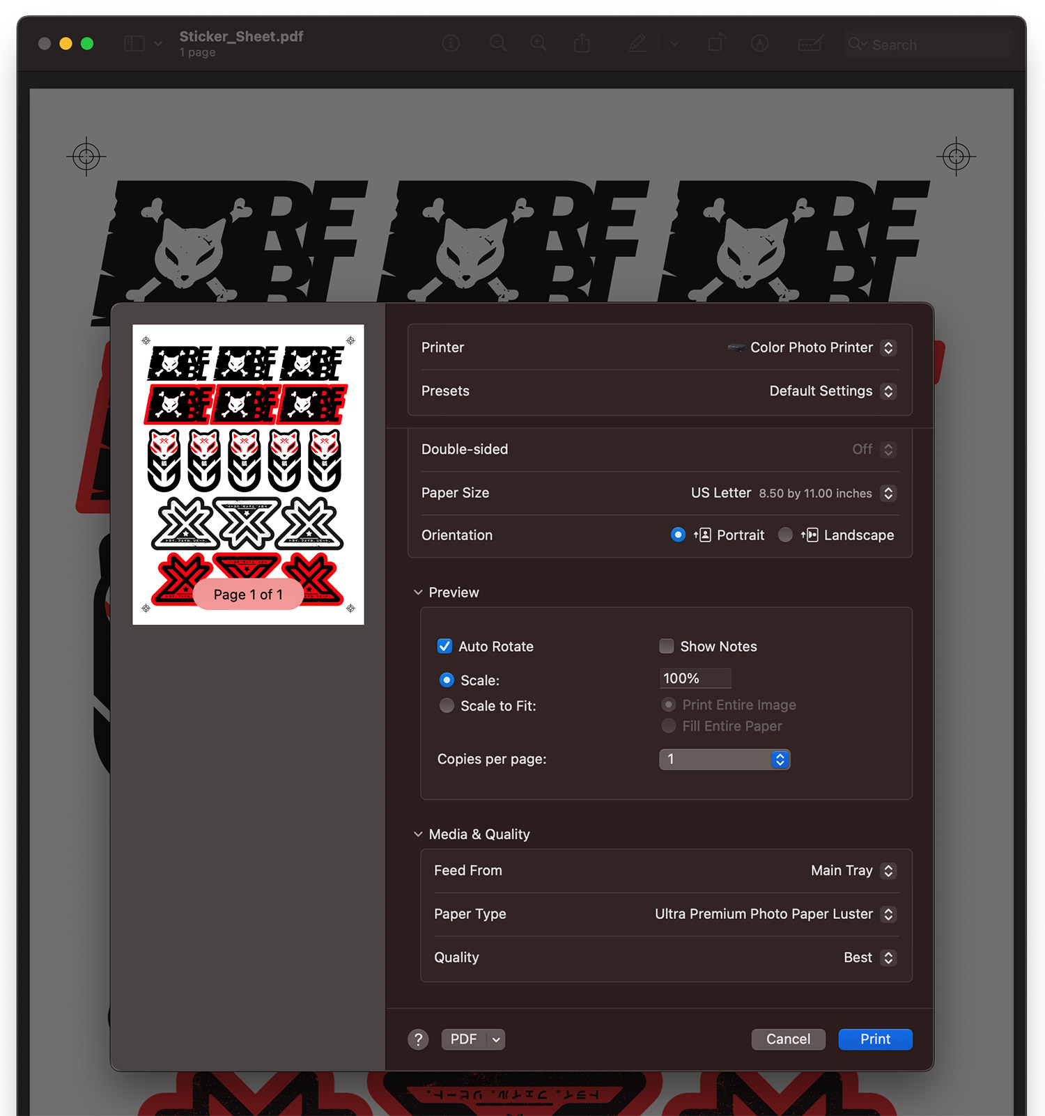 I generally save my artwork as a PDF and then print with Apple’s Preview app. Place your vinyl sticker paper into your printer, select “Best Quality” for the print, and make sure you print 8.5x11” (letter) size and at 100% scale. You want to make sure your artwork is printed at the exact size you had on the artboard.