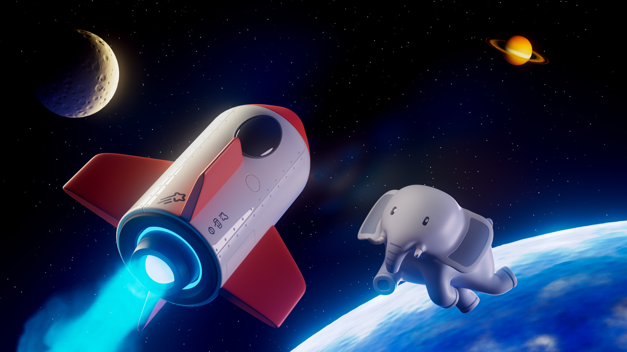 3D render of Ivory the elephant floating in space. Year 2024 Tools Cinema4D / Redshift Client Personal
